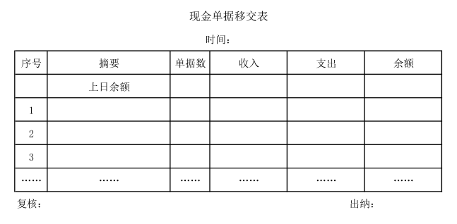 本表有出纳制作,会计复核签字;本表至少一式两份,也可以根据需要确定制作份数,分送需要掌握公司资金变化的财务负责人或总经理等。银行收付款单据移交也可以按该表格式制作,只是需要把表头改一改即可。