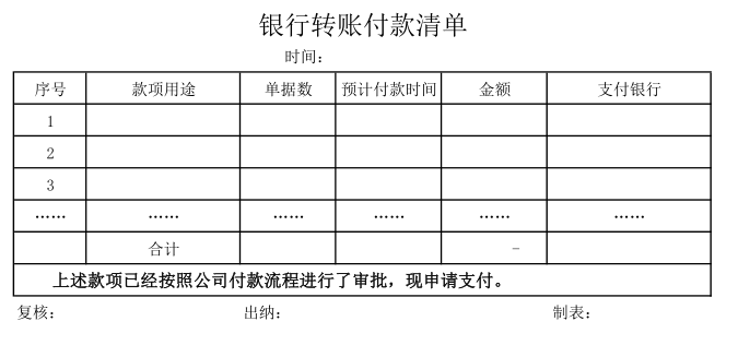 实务中,有些企业尤其是民营企业和无资金预算的单位,报账人员喜欢直接找出纳付款,而出纳由于本身遗失最后赔钱的事情也是时有发生等。因此,对于管理规范的企业应由资金管理岗向出纳传递付款依据而不是报账人员直接找出纳。为此,我们也是设计了两份表格:
